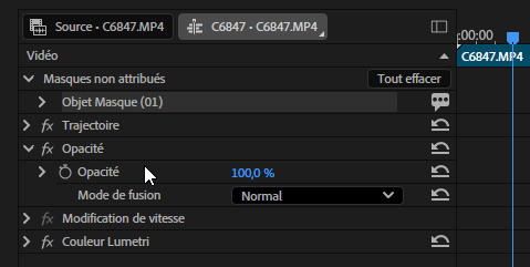 Le sujet est alors automatiquement détouré sur l’ensemble du rush. Cependant notre masque n’a pas encore été attribué (d’où les pointillés autour de la sélection). Il faut alors se rendre dans la fenêtre Options d’effets et glisser déposer notre masque sur la propriété Opacité afin d’attribuer notre masque.